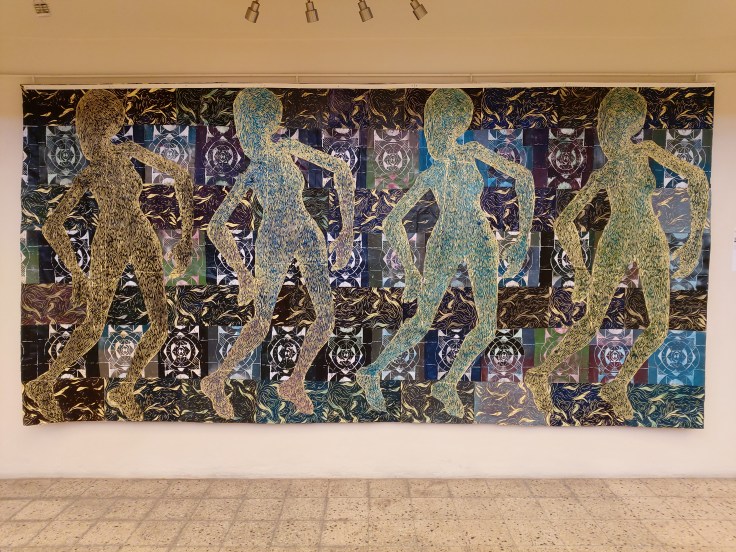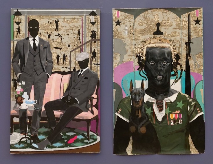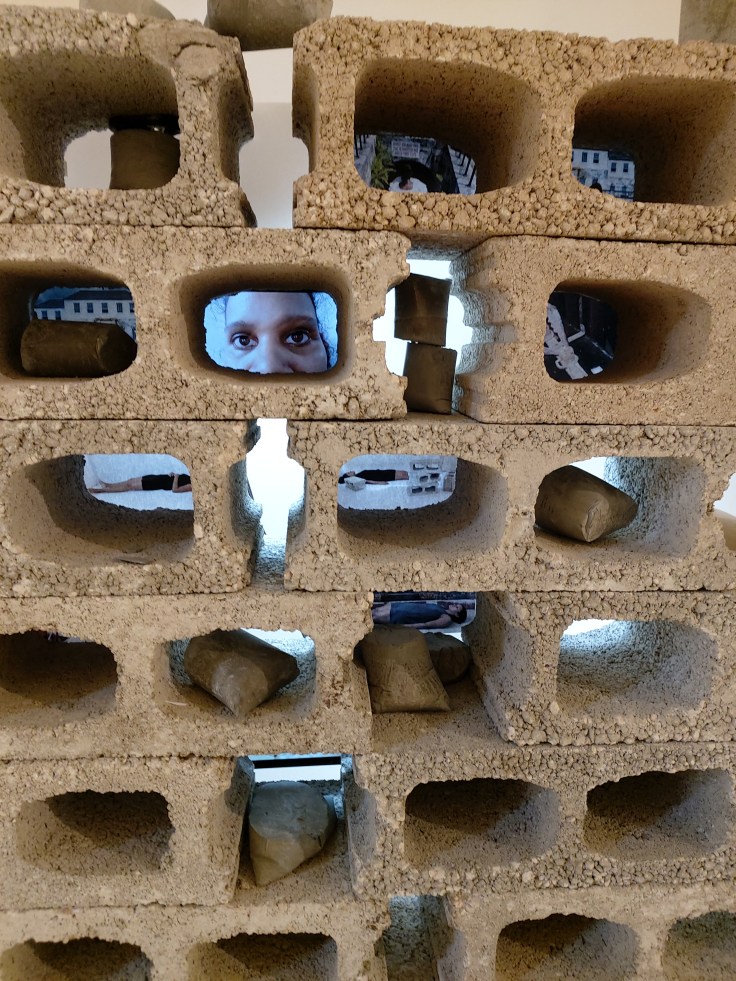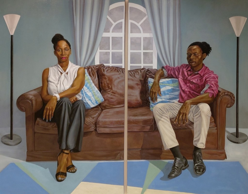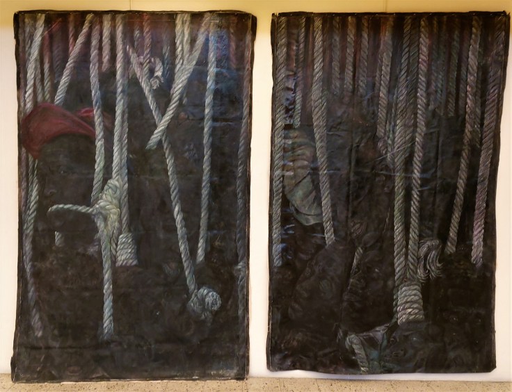 The exhibition comprised mostly paintings although other media such as fibre art (Coombs and Russell) and mixed media installation (Chedda and Haslam) were also included – figurative painting, continues to play a dominant role in contemporary Jamaican art. The diptych Mushroom Clouds by Greg Bailey, in which the cool, orderly realism of the scene was infused with a subtle, muted surrealism, spoke eloquently about social distance, personal tension, confinement, and forced domesticity. Xayvier Haughton’s haunting dark canvases, Ghede Arise I and II, with its clusters of hangman ropes and barely visible black faces, powerfully evoked the present reckoning with long histories of racial oppression, violence, and resistance. Camille Chedda’s installation, which consisted of stacked concrete bricks, with performative videos and photographs of the artist inserted, metaphorically addressed the violence against black bodies, and the possibilities of self-affirmation in response to such oppression.