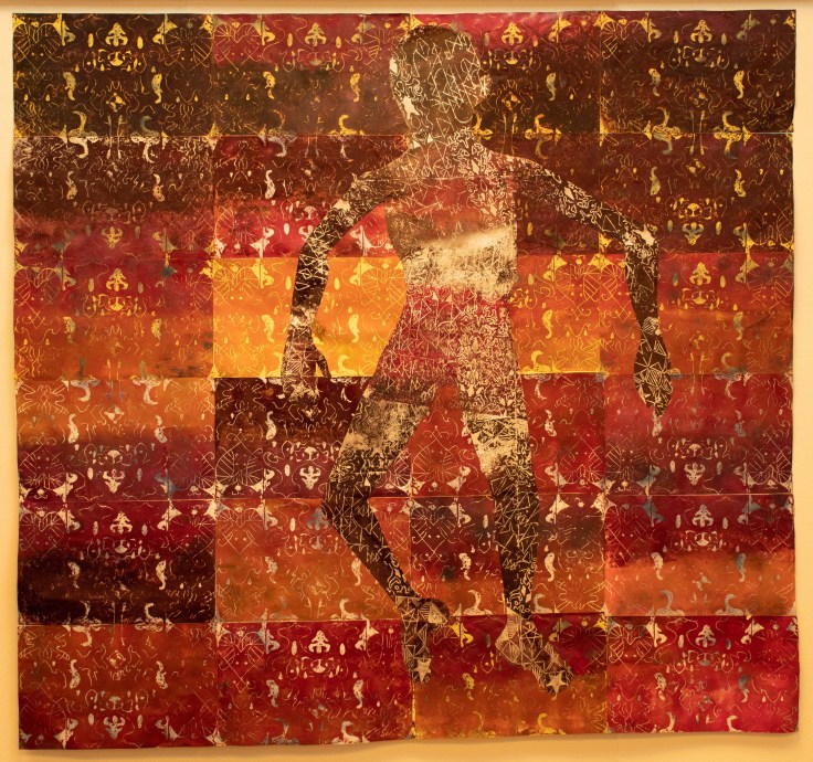 In Daniel Harrison’s large, multi-part mixed media prints, the body is practically devoid of any of the conventional markers of gender and sexuality, seemingly reduced to its spiritual essence, and placed in in juxtaposition with patterns that allude to African Diasporic spirituality. In a vivid illustration that contemporary art is not necessarily dismissive of traditional culture, Harrison’s work draws from the spiritual worlds that were explored by Jamaican popular artists and visionaries such as Everald Brown and Albert Artwell but also relates to the provocative and politicized imaginings of black futures of Afrofuturism (of which Black Panther is perhaps the best known pop culture exponent).