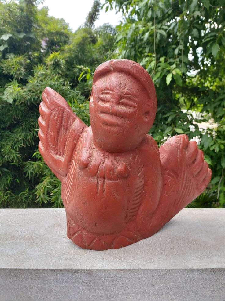 Woody used cedar root as his main material and allowed himself to be inspired by the evocative natural shapes of the wood, as other Jamaican self-taught sculptors also do. He initially carved with home-made implements although later patrons gifted him professional carving tool sets, which were easier to work with as he began to suffer from age-related arthritis. Most of his sculptures represented human figures, many with a fantastic edge, representing angels and other spiritual figures, although he also produced a few animal sculptures, pieces of furniture, walking staffs, and wooden hats. His style was minimalist, with roughly carved, simplified, stylized elements, and his sculptures usually had a mildly humorous, joyful, and benevolent quality. Most of his sculptures were titled and the naming process, which came after the completion of the work, was obviously important to him. Many of his titles (although referring to them as “names” would be more appropriate) associated his sculptures with actual persons, although they were not portraits in any conventional sense. I remember one named after the Jamaican politician Bobby Jones and others with names such as John Clappy and Sister Marie, that reference the world of Revival religion which provides the broader cultural context to Woody’s work.