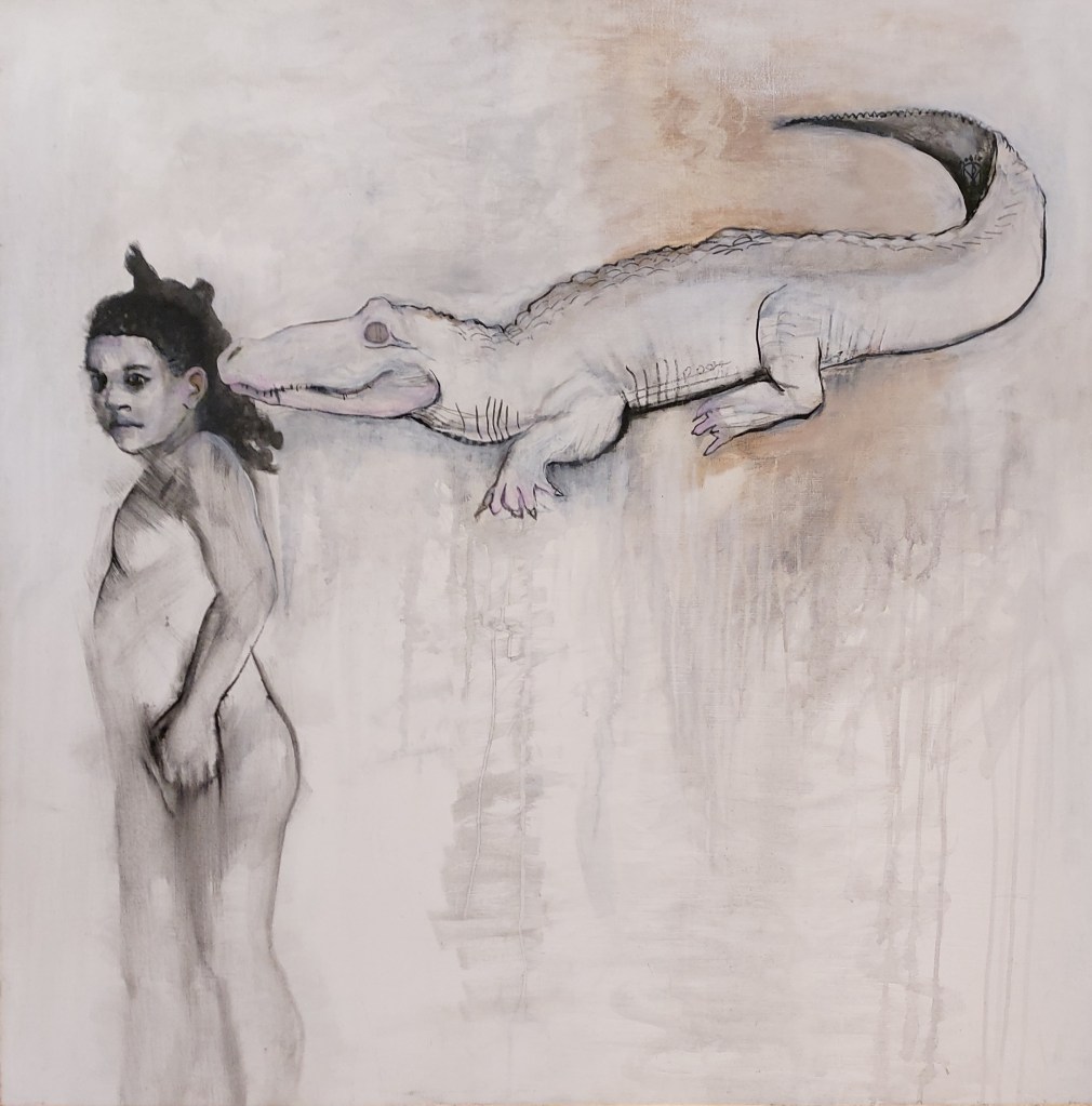 To frame the work of female artists as “women’s art” can be problematic, however, as not all female artists wish to be defined in such gendered terms. Many just want to be recognized as artists, without being constrained by any imposed assumptions about the nature of their work. The Vives exhibition, fortunately, does not make such pronouncements and is instead deftly and sensitively curated to allows the selected work to speak on its own terms. It is an exhibition in which the imagination rules and visual poetry is given full reign. An albino crocodile is whispering in the ears of a young girl in a dream-like image in the painting Chuchotements (2014) by Pascale Monnin, leaving us to wonder what the enigmatic murmurings are all about.