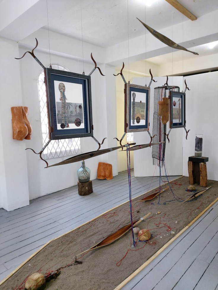 The most ambitious and perhaps closest collaboration in the exhibition is the large installation Passage: Break in Case of Emergency by Paula Daley and Laura Lee Jones, which occupies the smaller gallery in the back. The installation, which combines collage, found natural and manmade objects, and fabricated elements in metal and fibre, takes inspiration from the words of the former slave Esteban Montejo in the Cuban writer Miguel Barnett’s Autobiography of a Runaway Slave (1966). It particularly reflects on the question of “what makes a slave,” as this goes beyond the person’s legal status, and what are the long-term social and cultural implications of this construct, particularly in terms of the problematic ideas about black masculinity it has produced. I attended the artists’ talk on this installation and the artists spoke frankly and thoughtfully about their project, and particularly, on how they shared the conceptual and material development of the work.