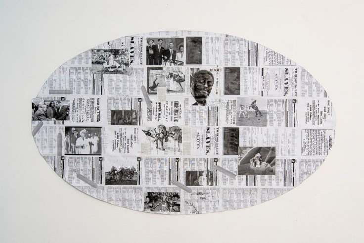 The two oval, achromatic collages that accompanied this chair in the exhibition were the last works I produced during my residency. In these works, I was looking at the seventies and eighties in Jamaica, the period when Manley and Seaga were in power. It was a very turbulent period, with the issues with the IMF and the CIA-led destabilization of the country, in which Seaga played an active role, the disruption of various Black nationalist groups, and then the Grenada invasion, so it was happening throughout the region. Manley had pursued Democratic Socialism which favored the black majority, which I believe was good and necessary for the country at that time. If only he had the will and self-determination to continue the program, maybe he wouldn’t have been subdued by the American neoliberal policymakers, and the black masses of Jamaica would have been in a much better position today. The images in these collages refer to these events and draw connections between the despotic leadership of Seaga and that of the current Andrew Holness led Government, while the text elements speak to the idea of chance and black people’s gamble for survival. These things happened before I was born, yet they continue to influence where we are today. Hence, history is the present.