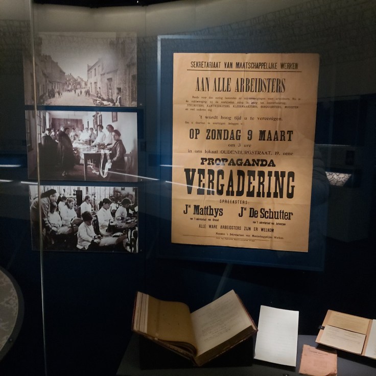 While lace is a luxury product, it was produced mostly by poor, otherwise uneducated women who worked from home and supplied the big lace retailers who then sold their work to a local and tourist clientele. It was delicate, time-consuming work, that was hard on the fingers and the eyes, and apparently quite poorly paid. The practice of working outdoors in the popular neighborhoods, which became an iconic part of picturesque Bruges’ image, had a lot to do with the lack of space, light and other basic comforts inside the small homes. There is no doubt that there was a level of exploitation in the lace sector and there is in fact a section in the Centre’s display that speaks to labor agitation and organization.